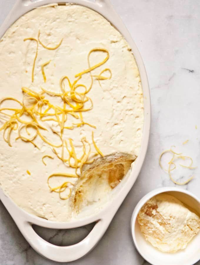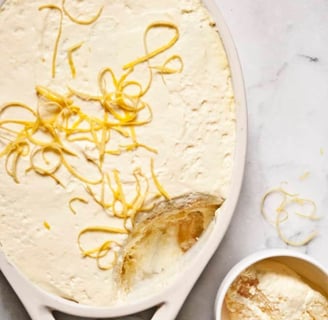 Dip ladyfingers briefly in the lemon syrup and arrange them in a single layer in an 8” x 11" dish - preferably non-metal.